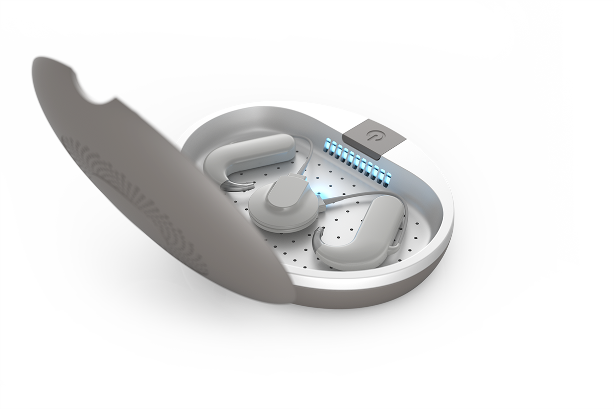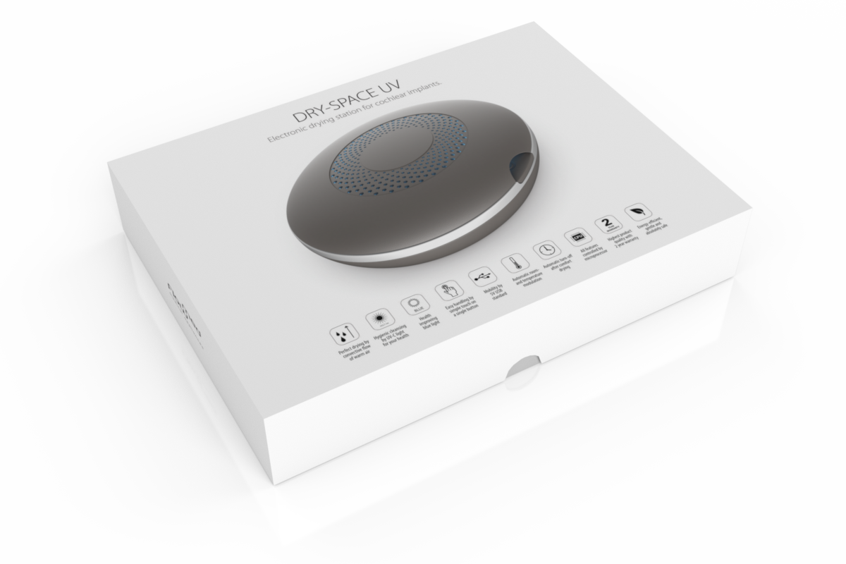 Dry-space uv to urządzenie elektroniczne z dodatkowym światłem UV-C i światłem niebieskim (380-495 mm) oraz wbudowanym złączem USB 2.0 do użytkowania w domu lub podczas podróży oraz przechowywania i pielęgnacji dedykowany głownie implantów ślimakowych (generatorów mowy) oraz aparatów słuchowych: modeli zausznych (BTE), wewnątrzusznych (ITE), wewnątrzkanałowych (CIC), modeli ze słuchawką zewnętrzną (RIC), generatorów szumów, wkładek usznych czy ochronnych przeciwhałasowych zatyczek do uszu.